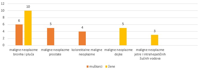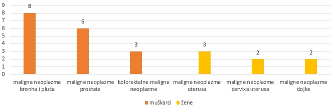 Muškarci su najčešće obolijevali od malignih neoplazmi bronha i pluća, prostate i kolorektalnih malignih neoplazmi.